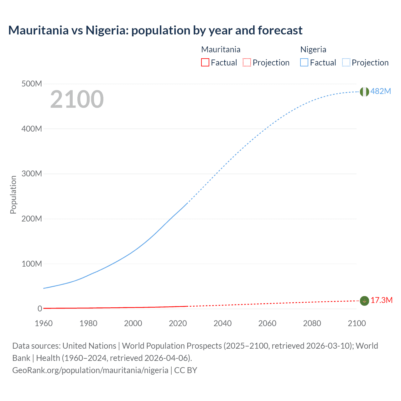 The latest officially reported population of Mauritania was 5,169,395 in 2024 vs 232,679,478 people in Nigeria in 2024. In 2026, based on the adjusted UN estimation, the current Mauritania's population is 5,505,206 people compared to 243,824,469 in Nigeria.