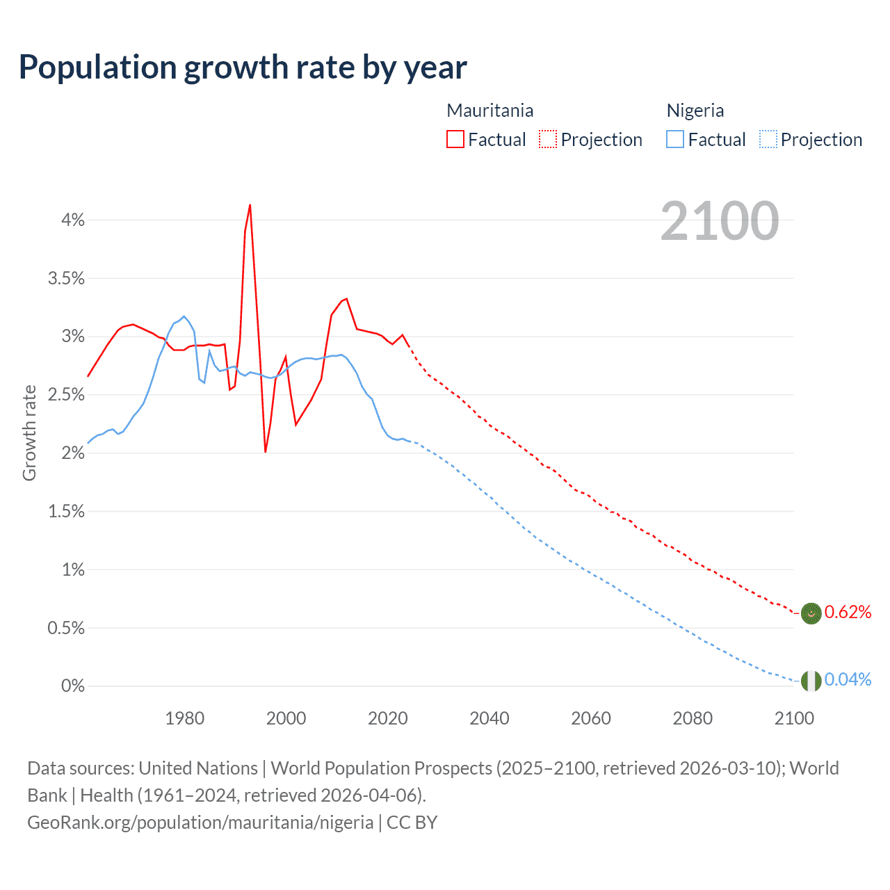 - For the last 10 years, Mauritania has had an average growth rate of +3% per year vs +2.31% in Nigeria.