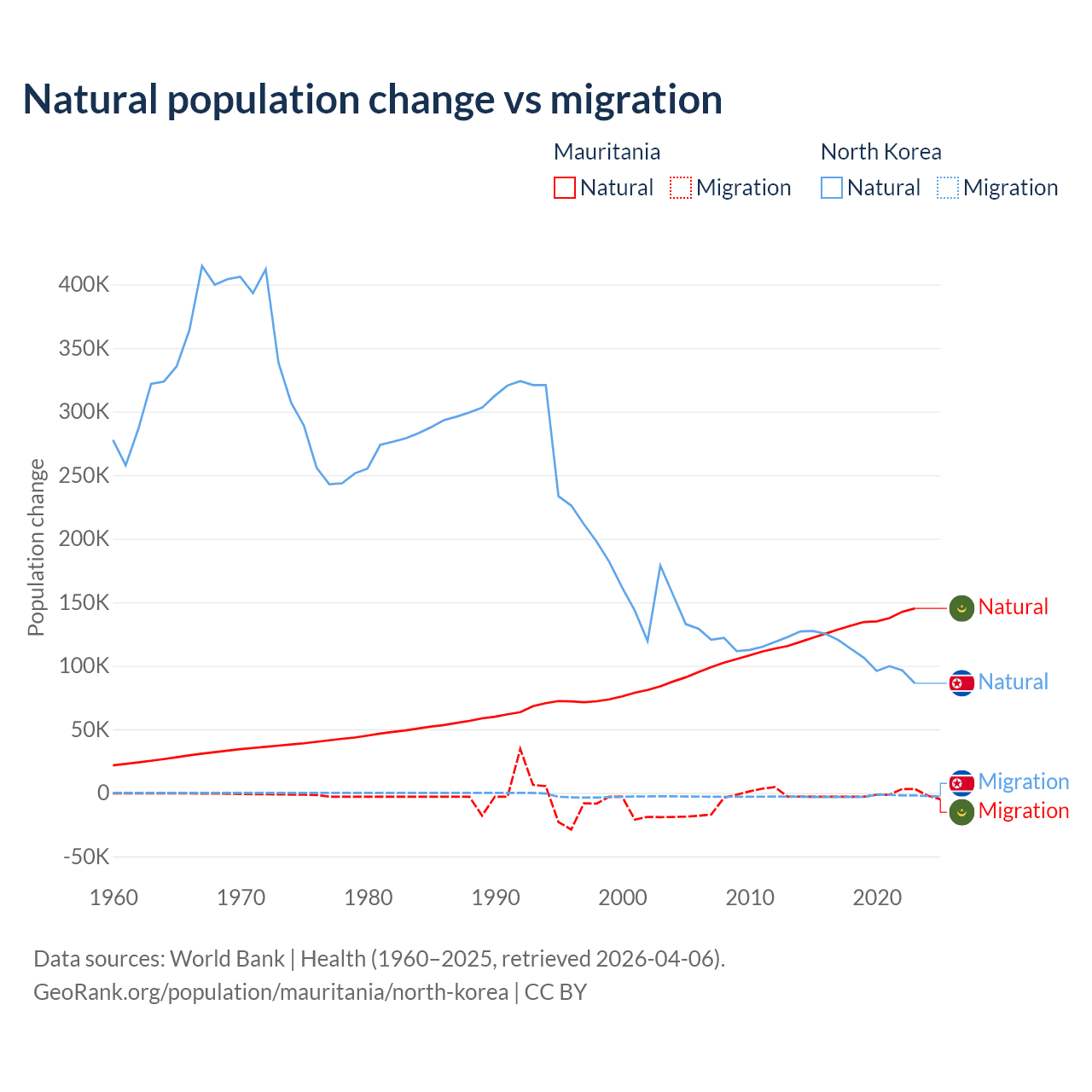 Over the last 10 years, 98.9% of the population change in Mauritania is from natural causes (a gain of 1,320,903 people) and 1.12% is from migration (a loss of 14,982 people). In North Korea 97.7% is from natural causes (a gain of 1,097,372 people) and 2.33% is from migration (a loss of 26,227 people).