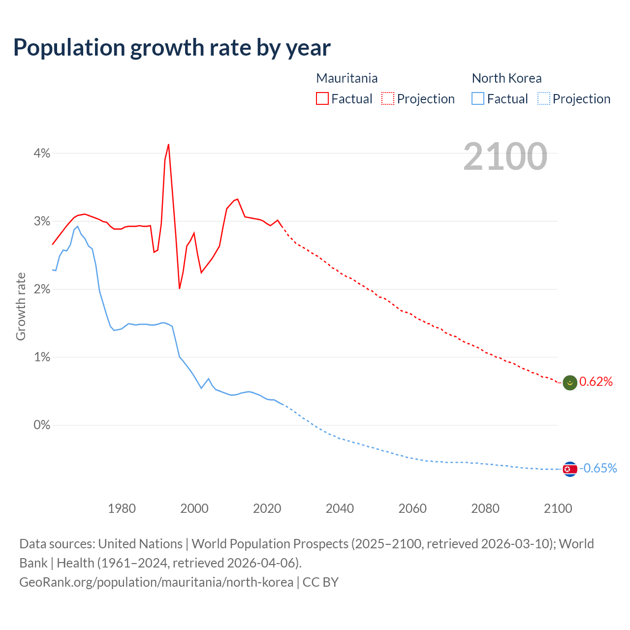 - For the last 10 years, Mauritania has had an average growth rate of +3% per year vs +0.41% in North Korea.