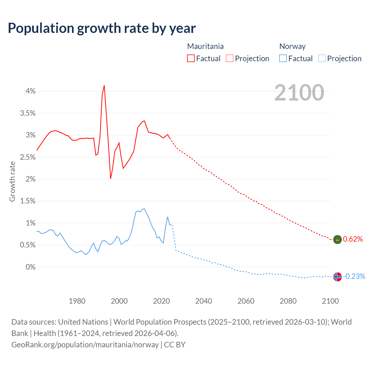 - For the last 10 years, Mauritania has had an average growth rate of +3% per year vs +0.85% in Norway.