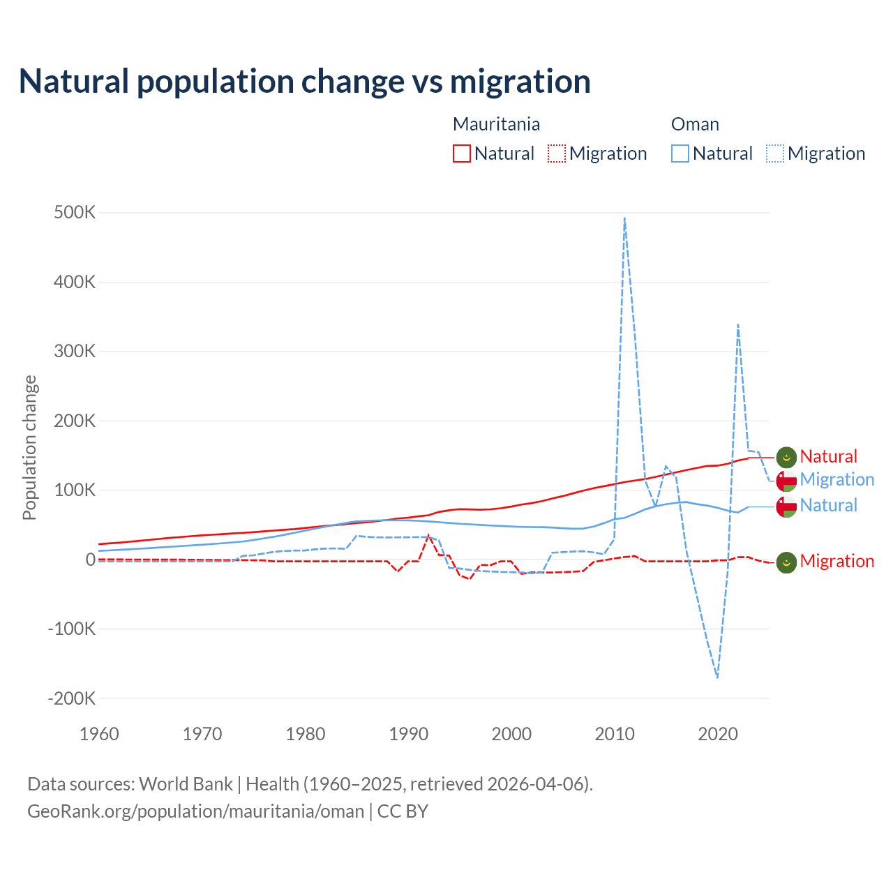 Over the last 10 years, 98.9% of the population change in Mauritania is from natural causes (a gain of 1,320,903 people) and 1.12% is from migration (a loss of 14,982 people). In Oman 61.6% is from natural causes (a gain of 763,049 people) and 38.4% is from migration (a gain of 475,565 people).