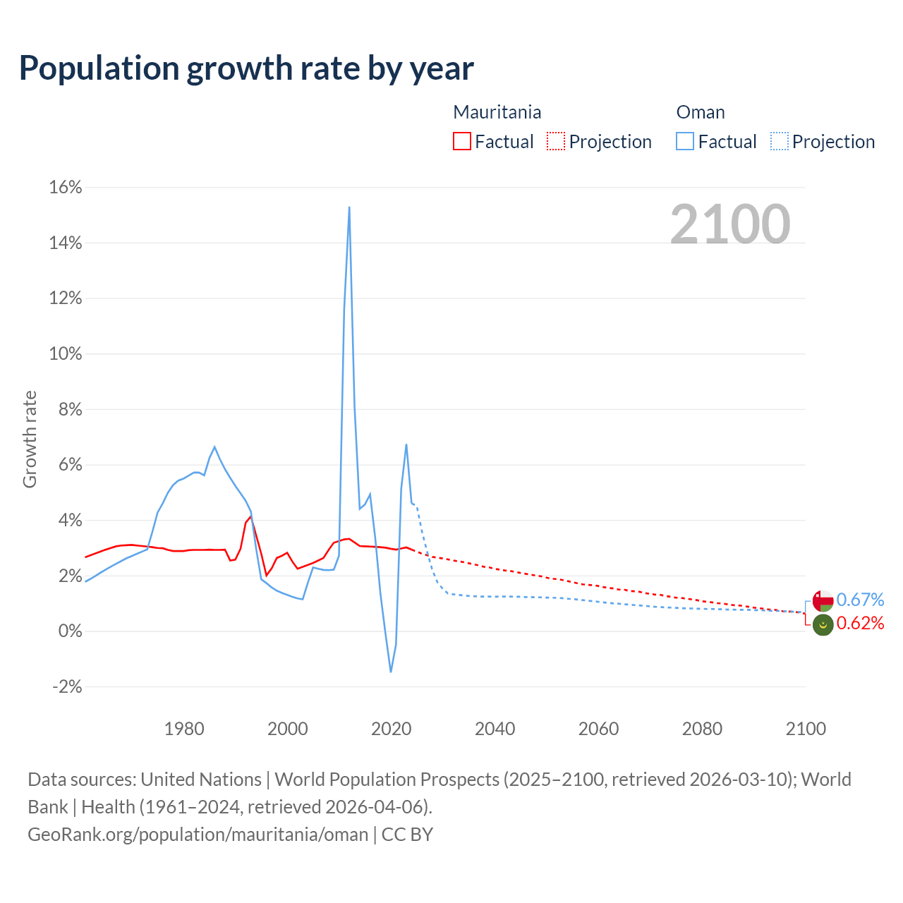 - For the last 10 years, Mauritania has had an average growth rate of +3% per year vs +2.99% in Oman.