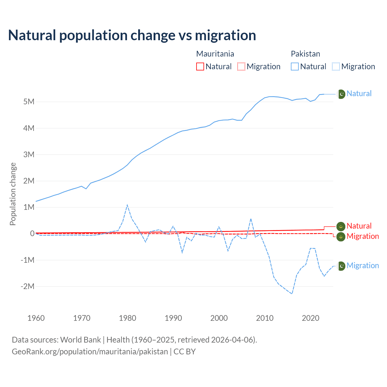 Over the last 10 years, 98.9% of the population change in Mauritania is from natural causes (a gain of 1,320,903 people) and 1.12% is from migration (a loss of 14,982 people). In Pakistan 77.8% is from natural causes (a gain of 51,255,404 people) and 22.2% is from migration (a loss of 14,629,055 people).