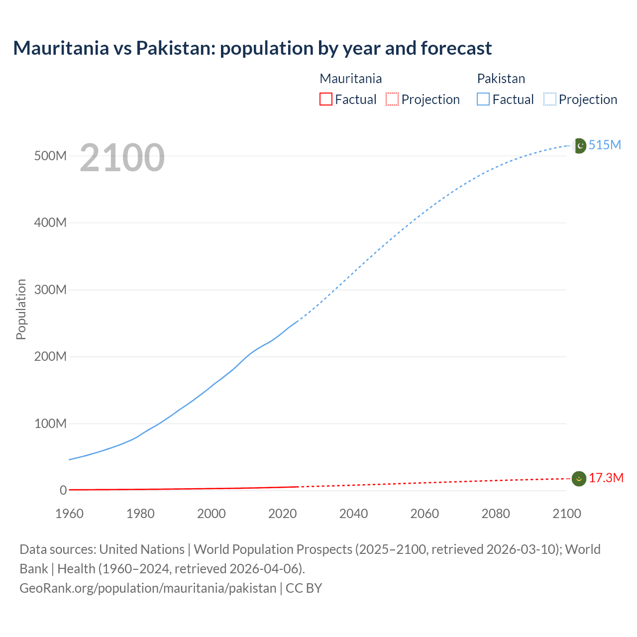 The latest officially reported population of Mauritania was 5,169,395 in 2024 vs 251,269,164 people in Pakistan in 2024. In 2026, based on the adjusted UN estimation, the current Mauritania's population is 5,505,206 people compared to 260,356,147 in Pakistan.