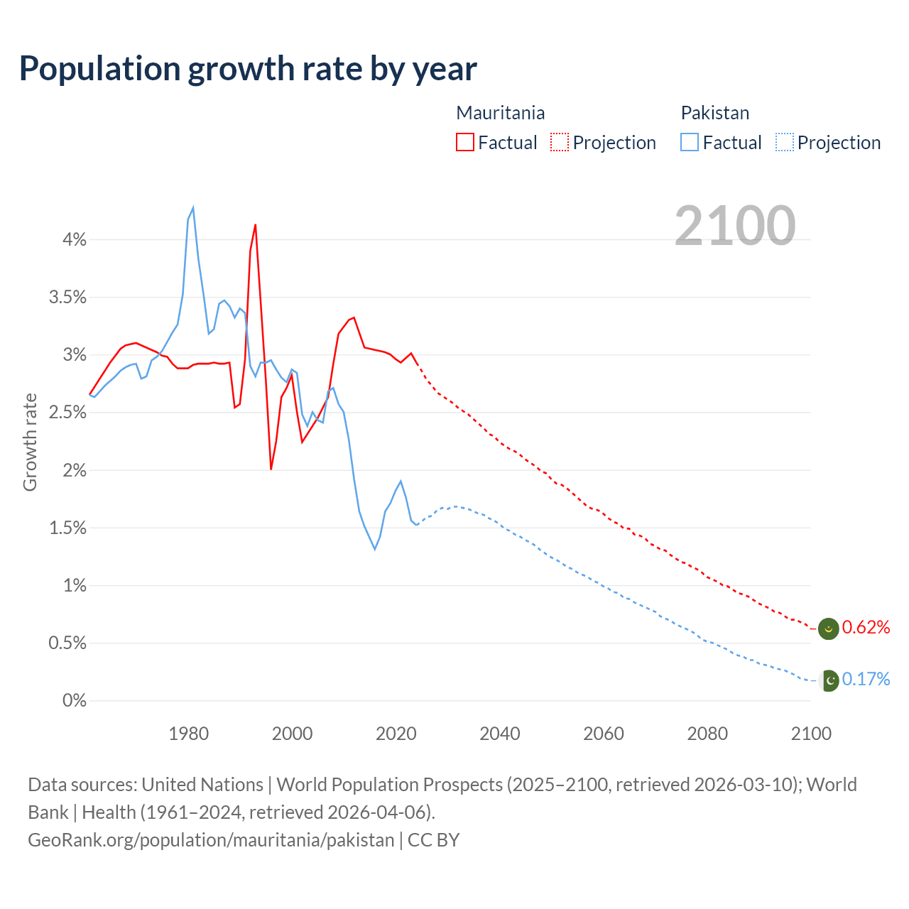 - For the last 10 years, Mauritania has had an average growth rate of +3% per year vs +1.6% in Pakistan.