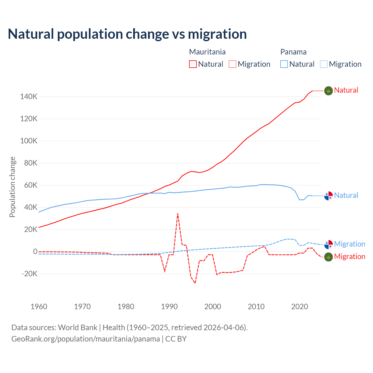 Over the last 10 years, 98.9% of the population change in Mauritania is from natural causes (a gain of 1,320,903 people) and 1.12% is from migration (a loss of 14,982 people). In Panama 86.5% is from natural causes (a gain of 544,211 people) and 13.5% is from migration (a gain of 84,849 people).