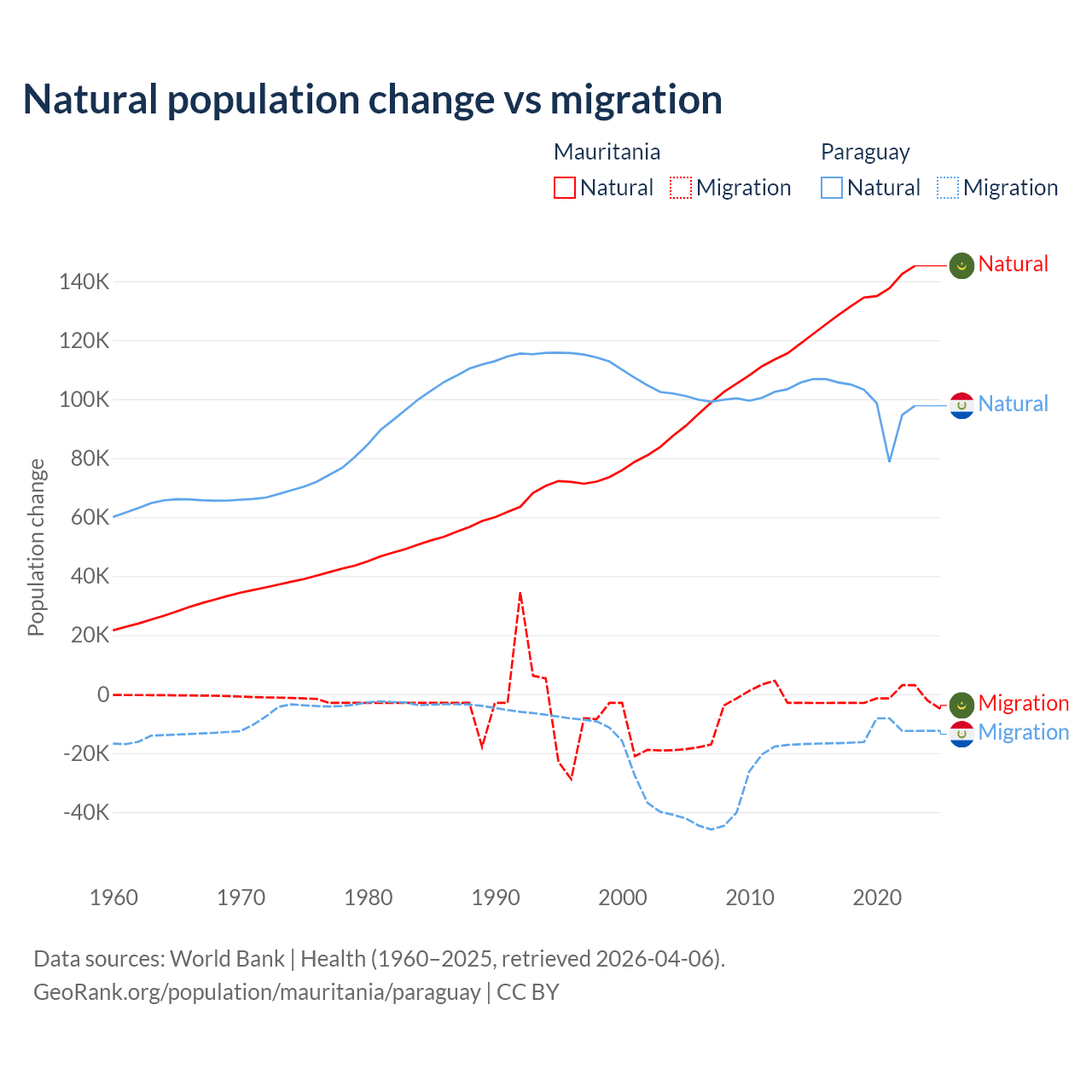 Over the last 10 years, 98.9% of the population change in Mauritania is from natural causes (a gain of 1,320,903 people) and 1.12% is from migration (a loss of 14,982 people). In Paraguay 87.6% is from natural causes (a gain of 1,002,636 people) and 12.4% is from migration (a loss of 141,377 people).