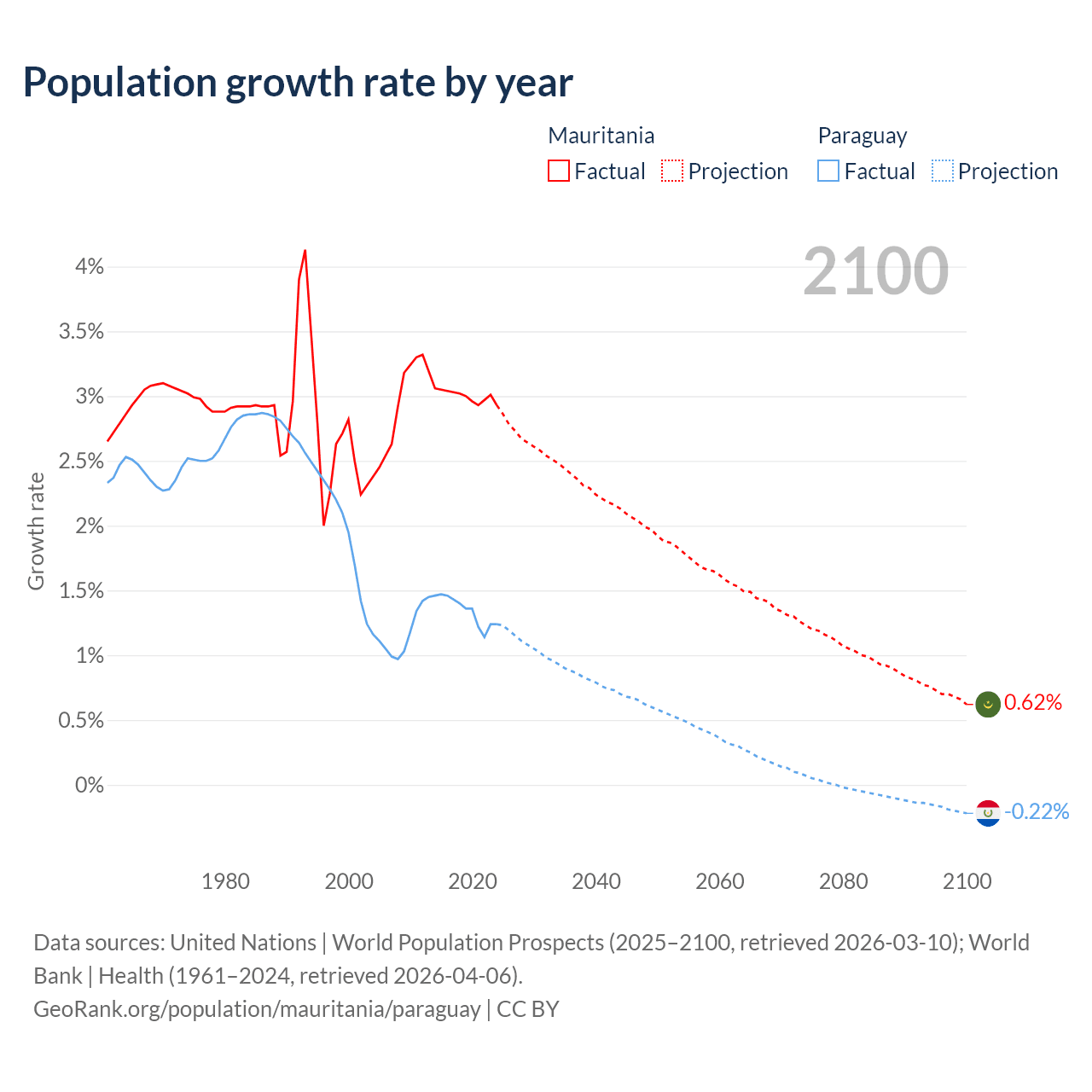 - For the last 10 years, Mauritania has had an average growth rate of +3% per year vs +1.34% in Paraguay.