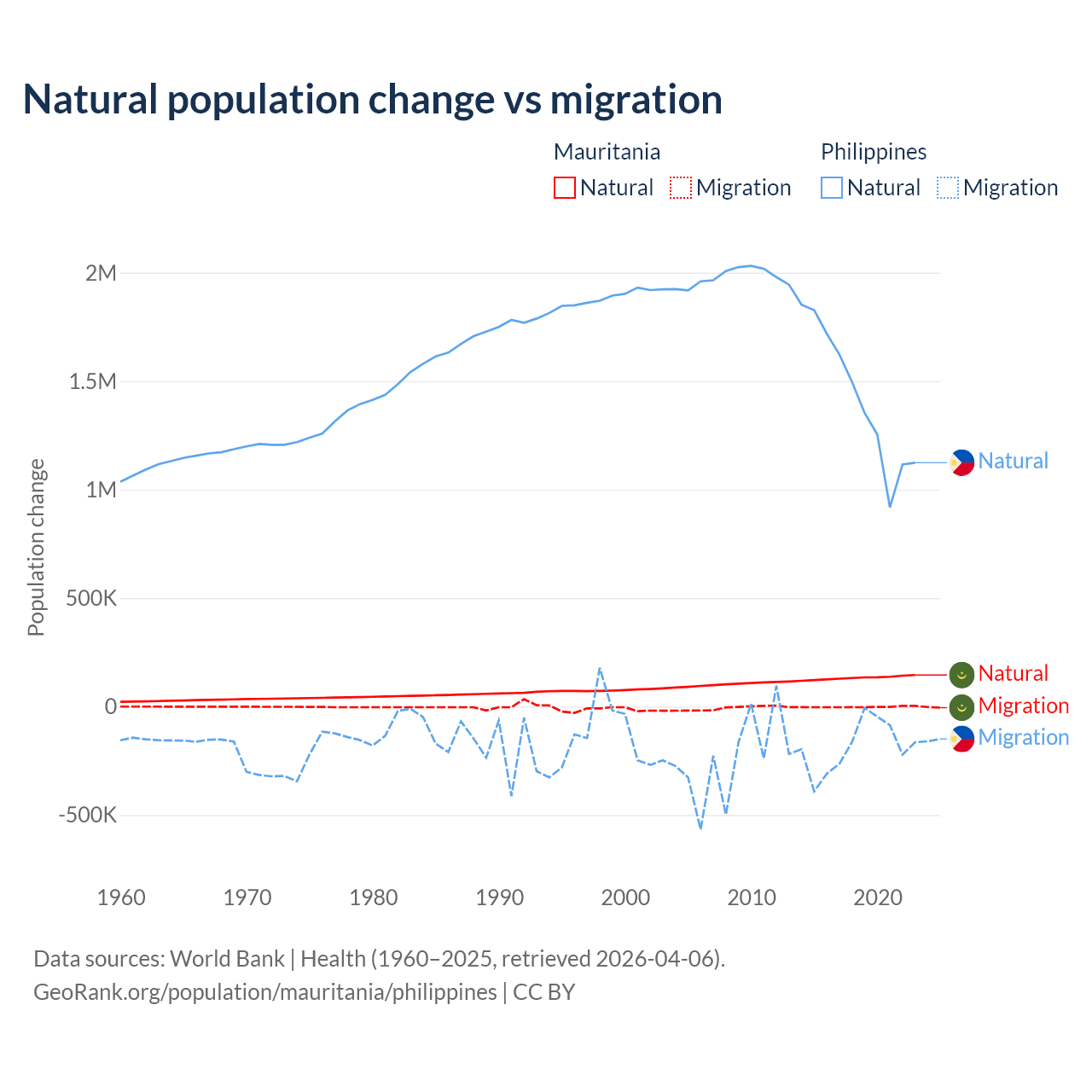 Over the last 10 years, 98.9% of the population change in Mauritania is from natural causes (a gain of 1,320,903 people) and 1.12% is from migration (a loss of 14,982 people). In the Philippines 88.5% is from natural causes (a gain of 14,279,705 people) and 11.5% is from migration (a loss of 1,848,117 people).