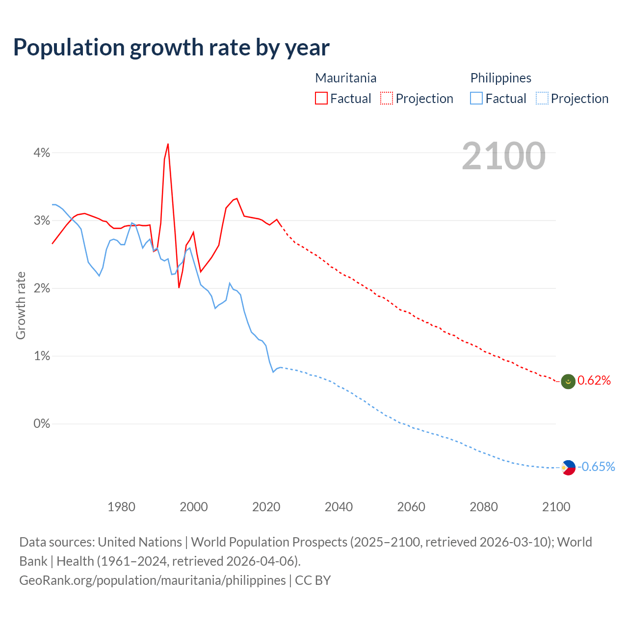 - For the last 10 years, Mauritania has had an average growth rate of +3% per year vs +1.16% in the Philippines.