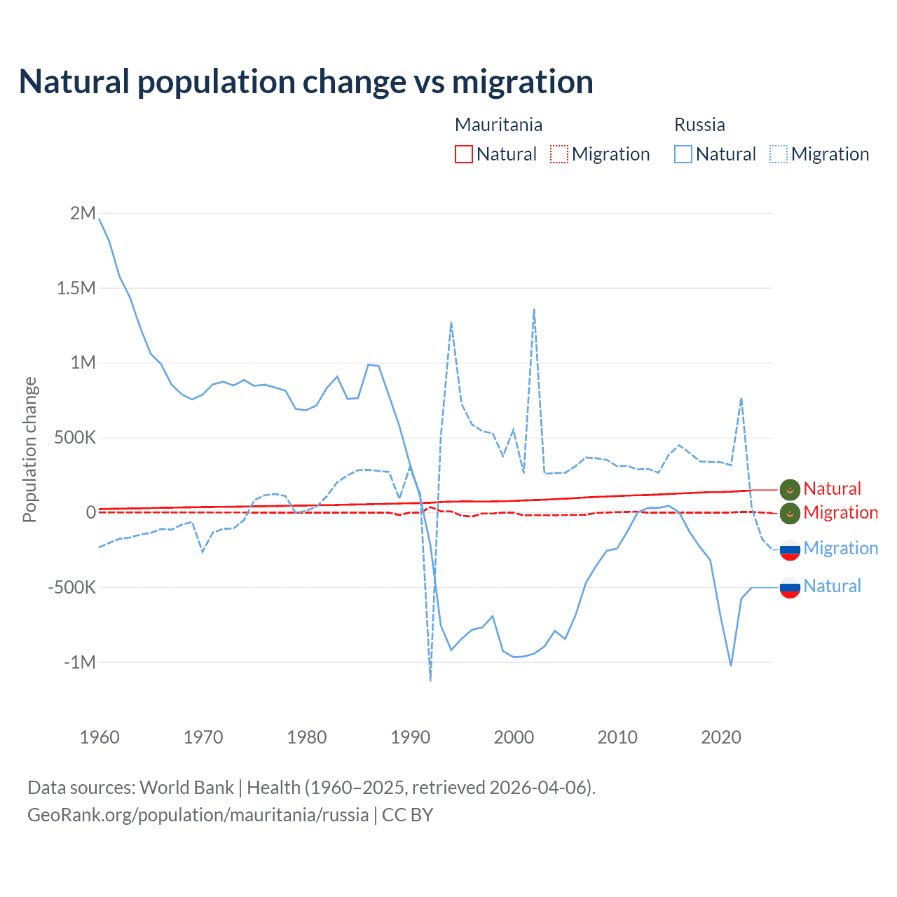 Over the last 10 years, 98.9% of the population change in Mauritania is from natural causes (a gain of 1,320,903 people) and 1.12% is from migration (a loss of 14,982 people). In Russia 48.6% is from natural causes (a loss of 3,416,377 people) and 51.4% is from migration (a gain of 3,611,826 people).