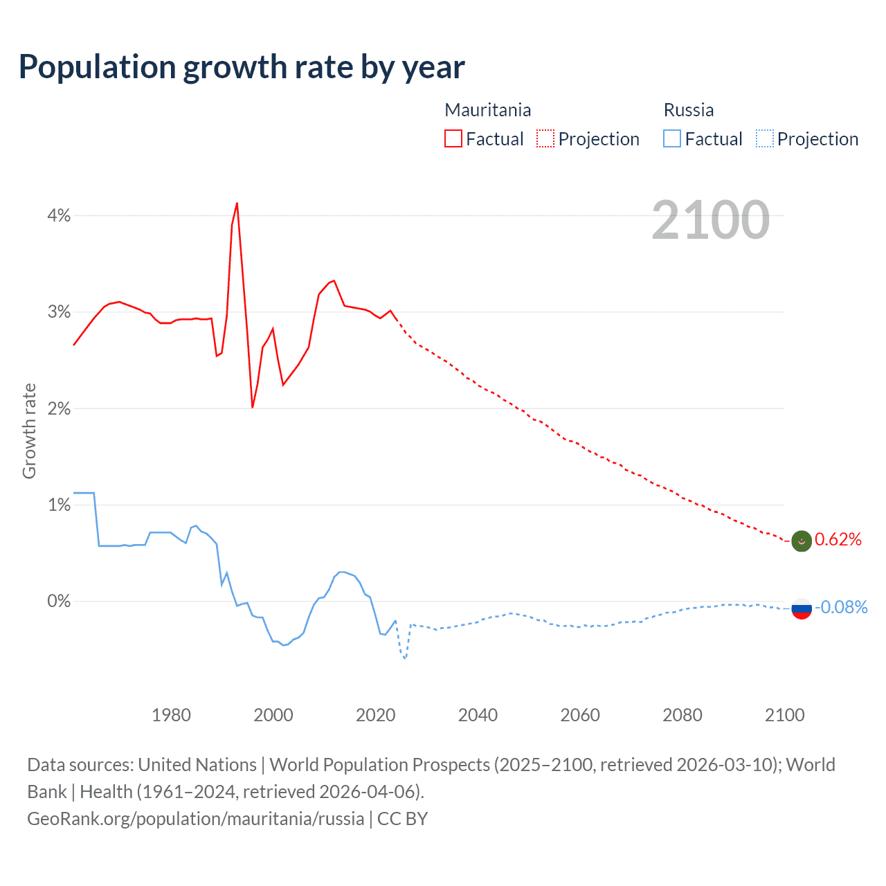 - For the last 10 years, Mauritania has had an average growth rate of +3% per year vs -0.02% in Russia.