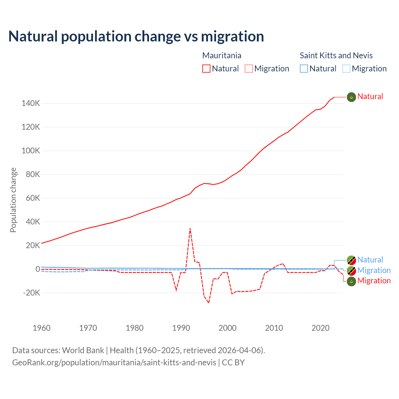 Over the last 10 years, 98.9% of the population change in Mauritania is from natural causes (a gain of 1,320,903 people) and 1.12% is from migration (a loss of 14,982 people). In Saint Kitts and Nevis 44.9% is from natural causes (a gain of 1,225 people) and 55.1% is from migration (a loss of 1,506 people).
