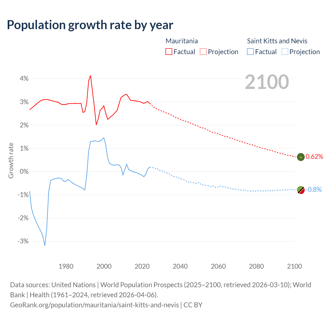 - For the last 10 years, Mauritania has had an average growth rate of +3% per year vs -0.04% in Saint Kitts and Nevis.