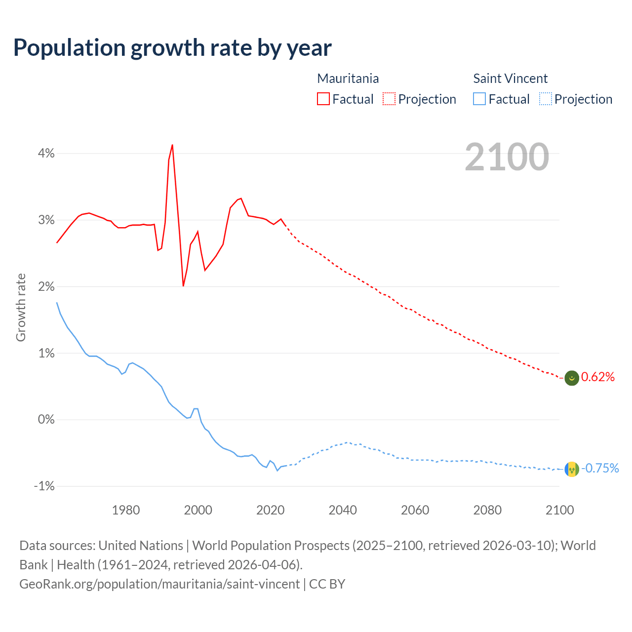 - For the last 10 years, Mauritania has had an average growth rate of +3% per year vs -0.65% in Saint Vincent.