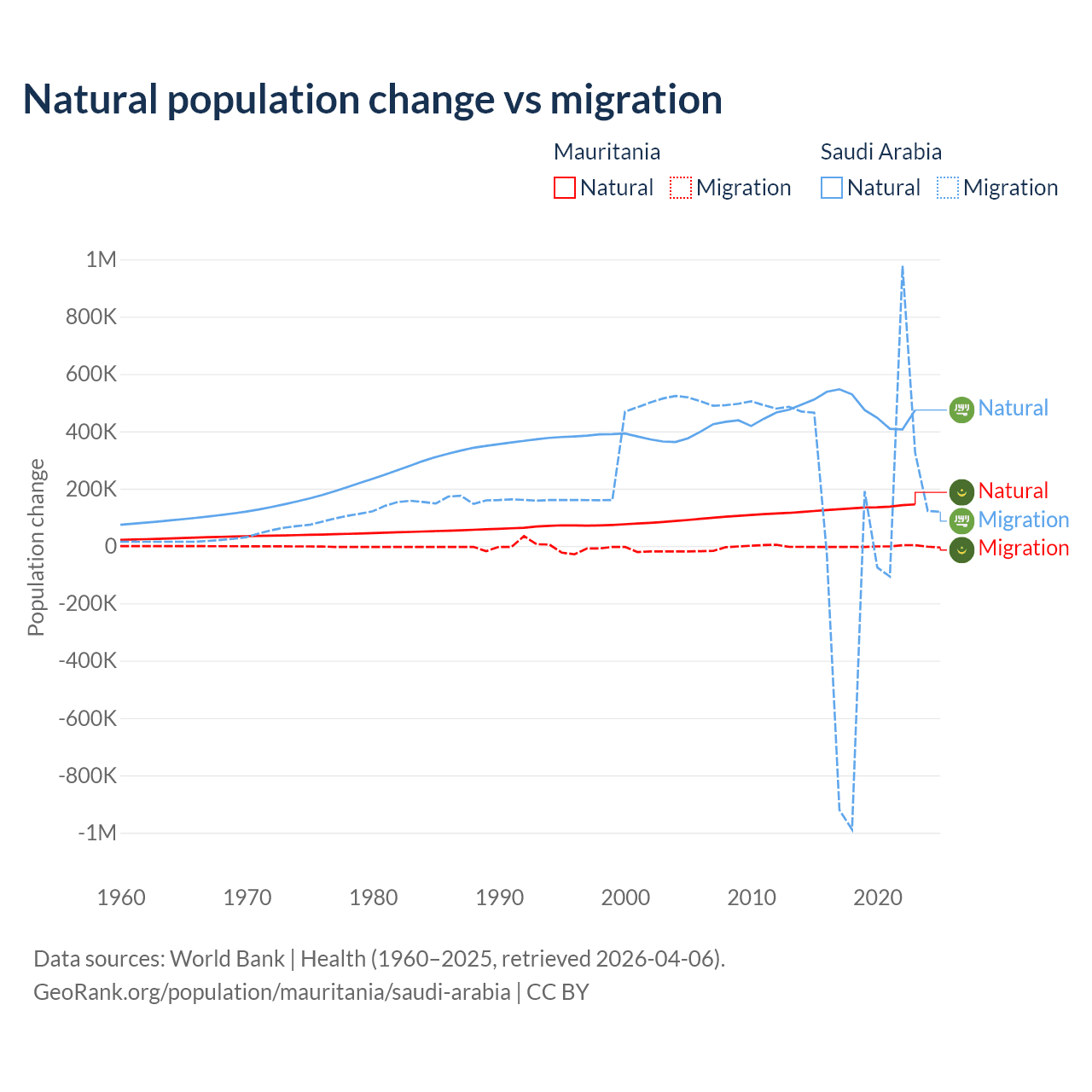 Over the last 10 years, 98.9% of the population change in Mauritania is from natural causes (a gain of 1,320,903 people) and 1.12% is from migration (a loss of 14,982 people). In Saudi Arabia 93.9% is from natural causes (a gain of 4,829,562 people) and 6.05% is from migration (a gain of 311,209 people).