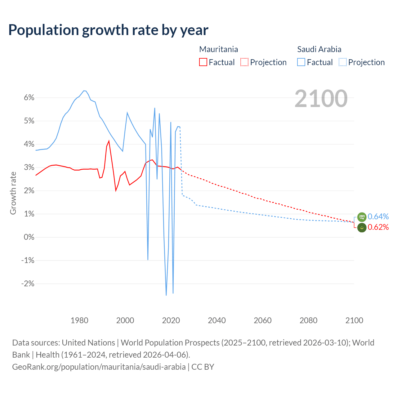 Mauritania vs Saudi Arabia: population by year and forecast
