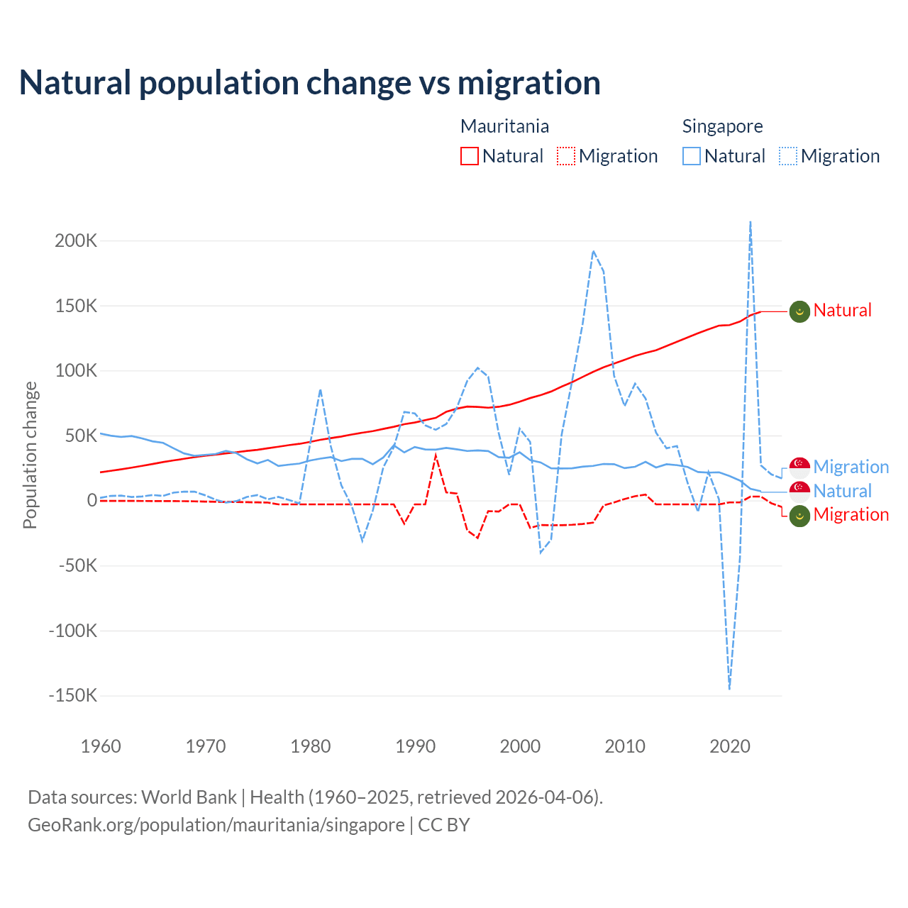 Over the last 10 years, 98.9% of the population change in Mauritania is from natural causes (a gain of 1,320,903 people) and 1.12% is from migration (a loss of 14,982 people). In Singapore 54.8% is from natural causes (a gain of 195,953 people) and 45.2% is from migration (a gain of 161,805 people).