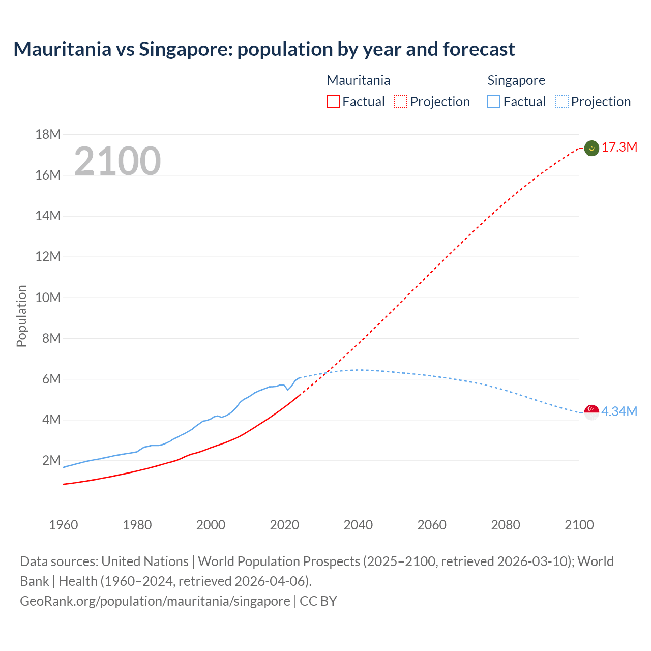 Mauritania vs Singapore: population by year and forecast