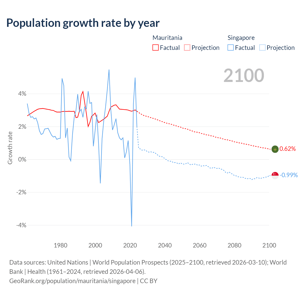 - For the last 10 years, Mauritania has had an average growth rate of +3% per year vs +1.04% in Singapore.