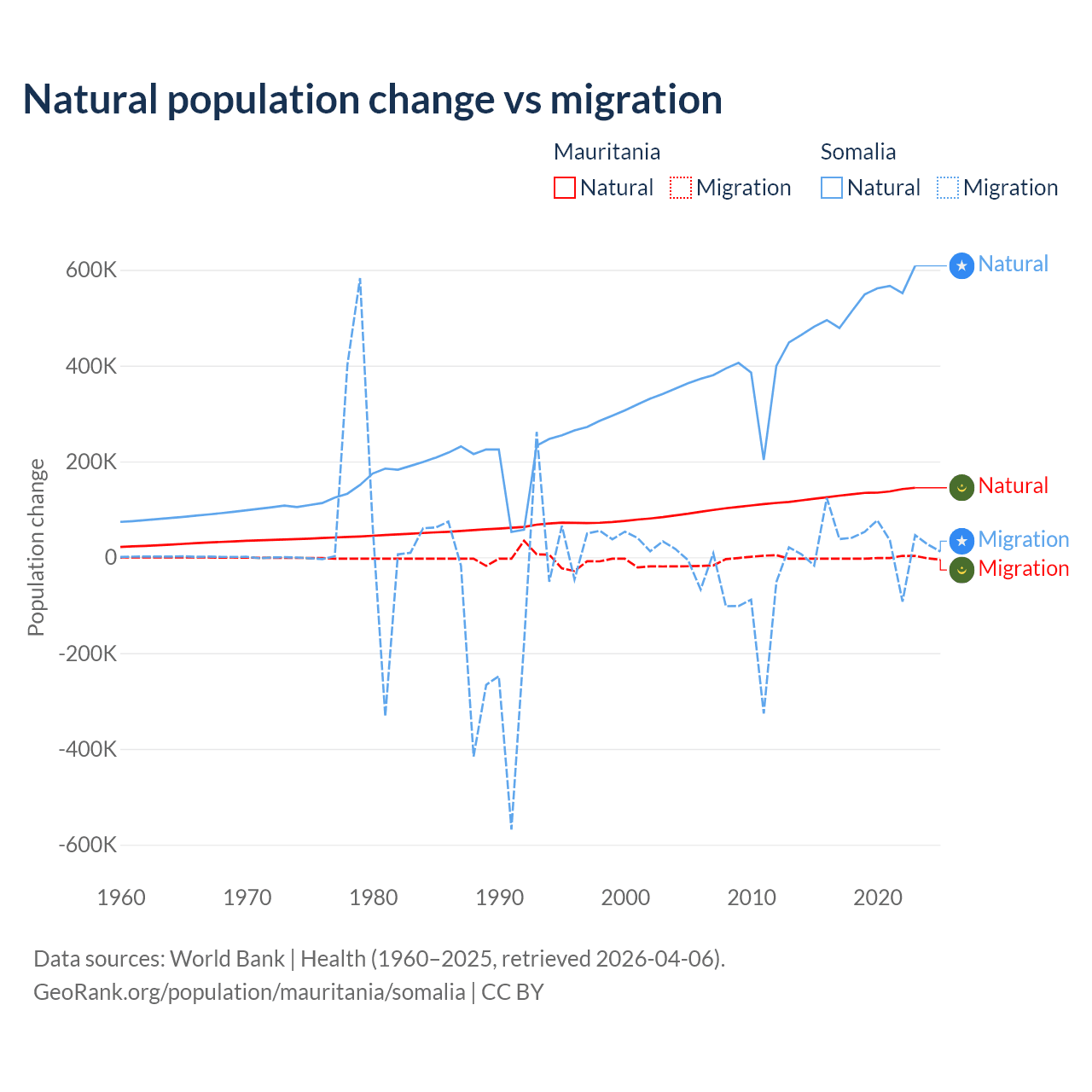 Over the last 10 years, 98.9% of the population change in Mauritania is from natural causes (a gain of 1,320,903 people) and 1.12% is from migration (a loss of 14,982 people). In Somalia 94.4% is from natural causes (a gain of 5,270,105 people) and 5.58% is from migration (a gain of 311,487 people).