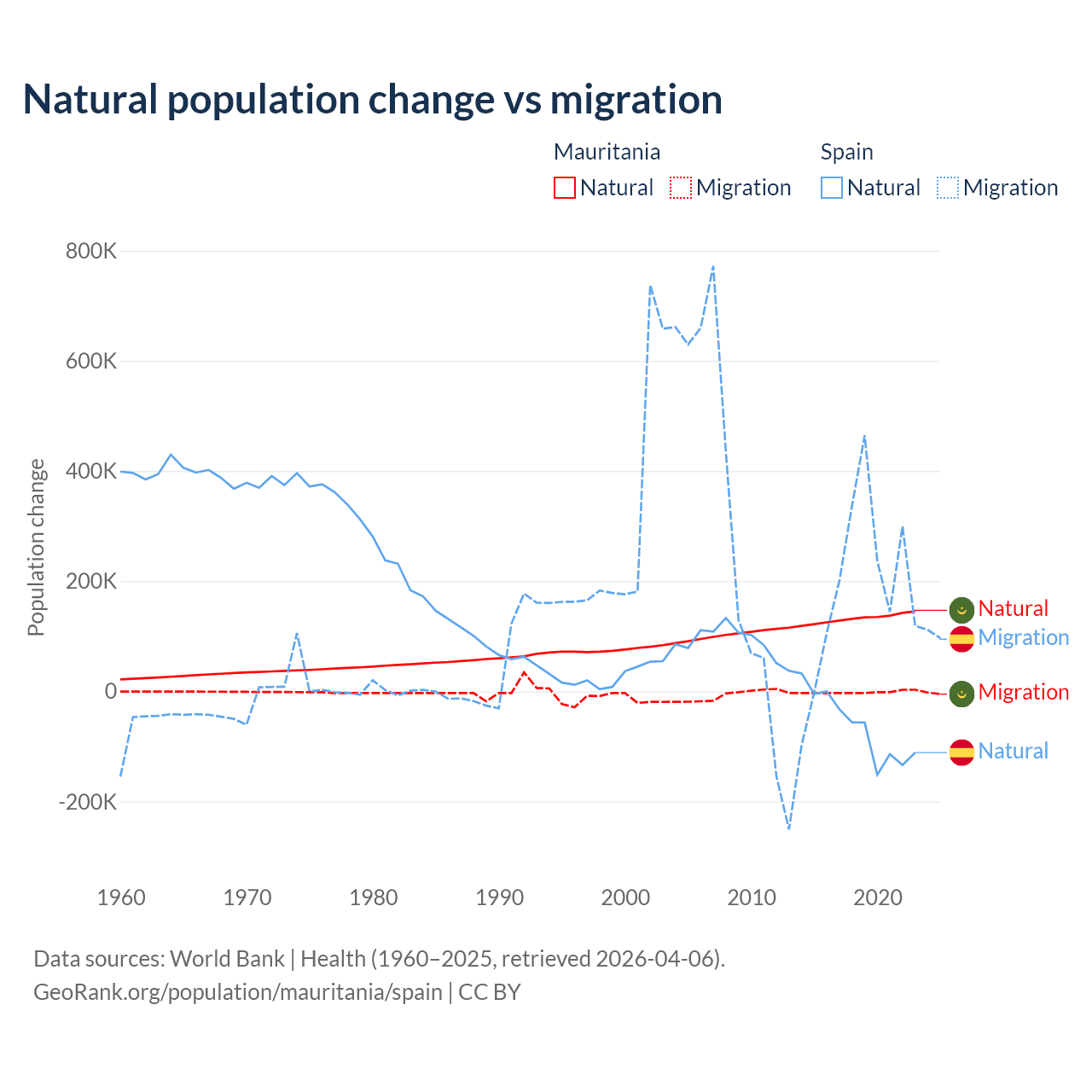 Over the last 10 years, 98.9% of the population change in Mauritania is from natural causes (a gain of 1,320,903 people) and 1.12% is from migration (a loss of 14,982 people). In Spain 25.8% is from natural causes (a loss of 627,829 people) and 74.2% is from migration (a gain of 1,810,127 people).