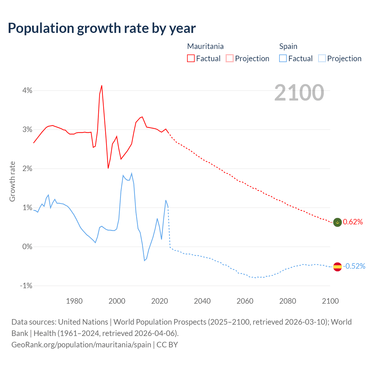 - For the last 10 years, Mauritania has had an average growth rate of +3% per year vs +0.43% in Spain.