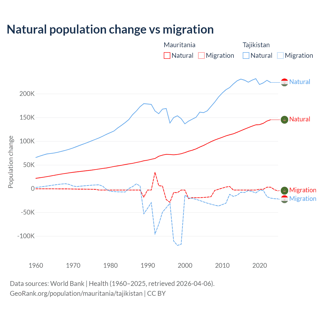 Over the last 10 years, 98.9% of the population change in Mauritania is from natural causes (a gain of 1,320,903 people) and 1.12% is from migration (a loss of 14,982 people). In Tajikistan 96% is from natural causes (a gain of 2,266,045 people) and 3.95% is from migration (a loss of 93,205 people).