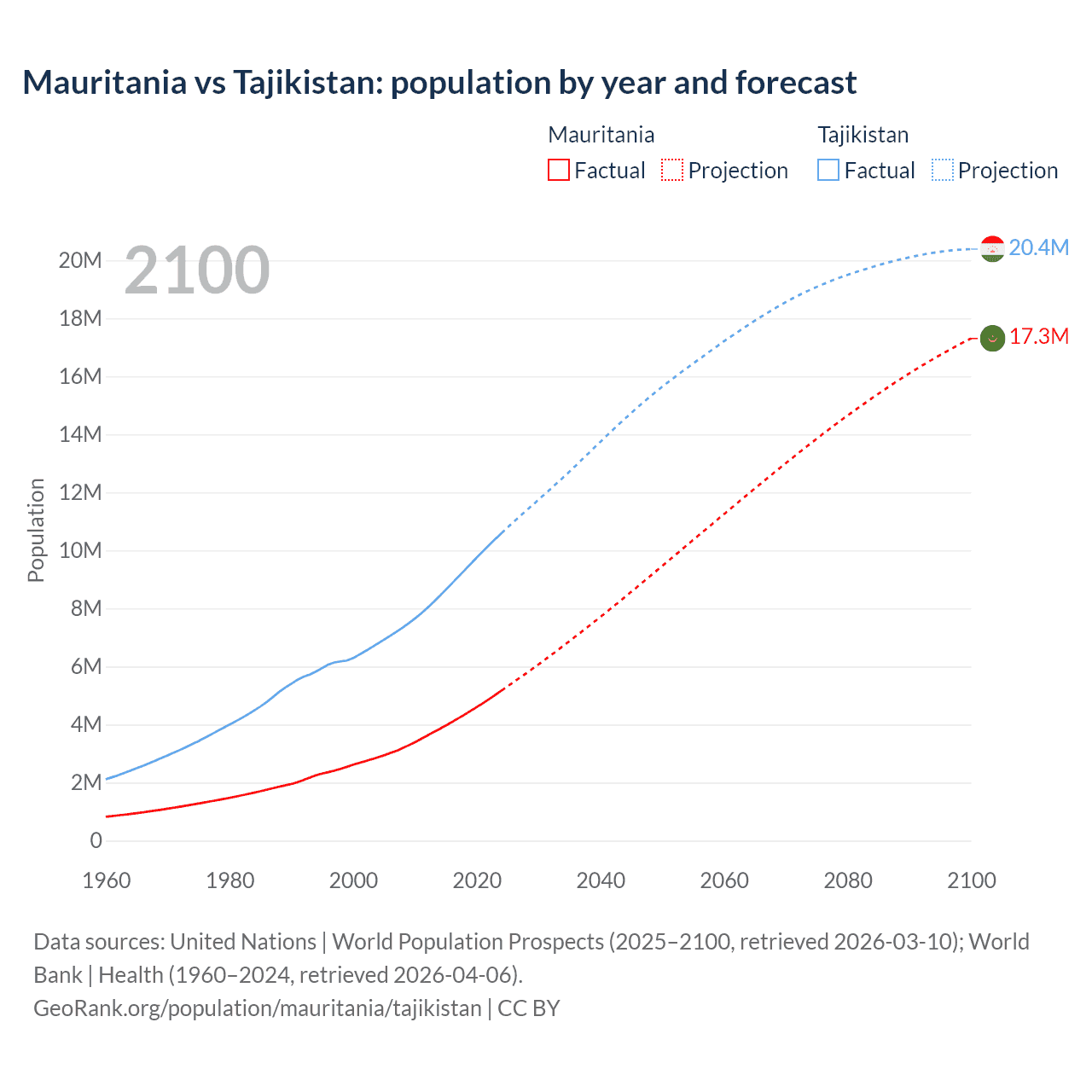 The latest officially reported population of Mauritania was 5,169,395 in 2024 vs 10,590,927 people in Tajikistan in 2024. In 2026, based on the adjusted UN estimation, the current Mauritania's population is 5,505,206 people compared to 11,038,274 in Tajikistan.