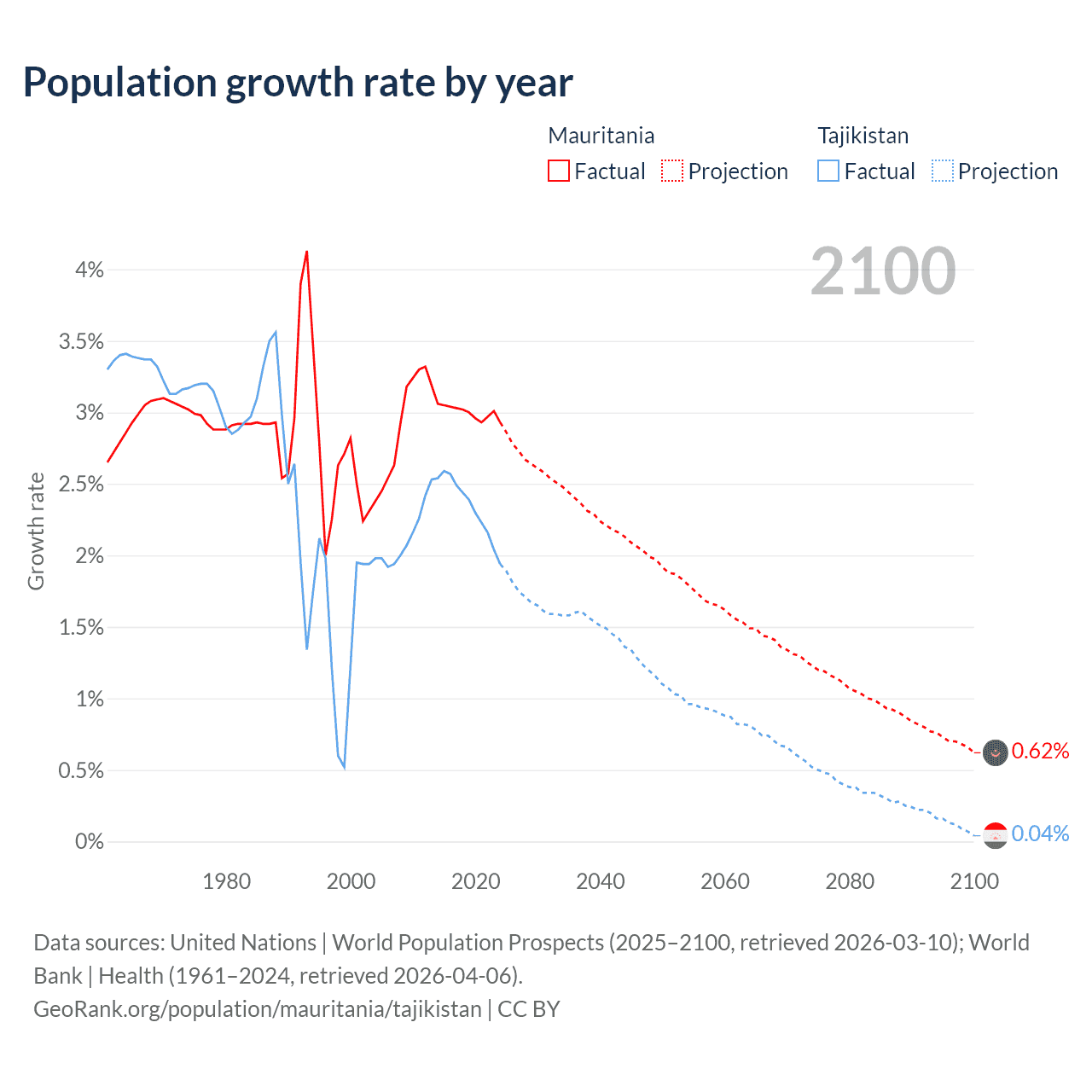 - For the last 10 years, Mauritania has had an average growth rate of +3% per year vs +2.33% in Tajikistan.