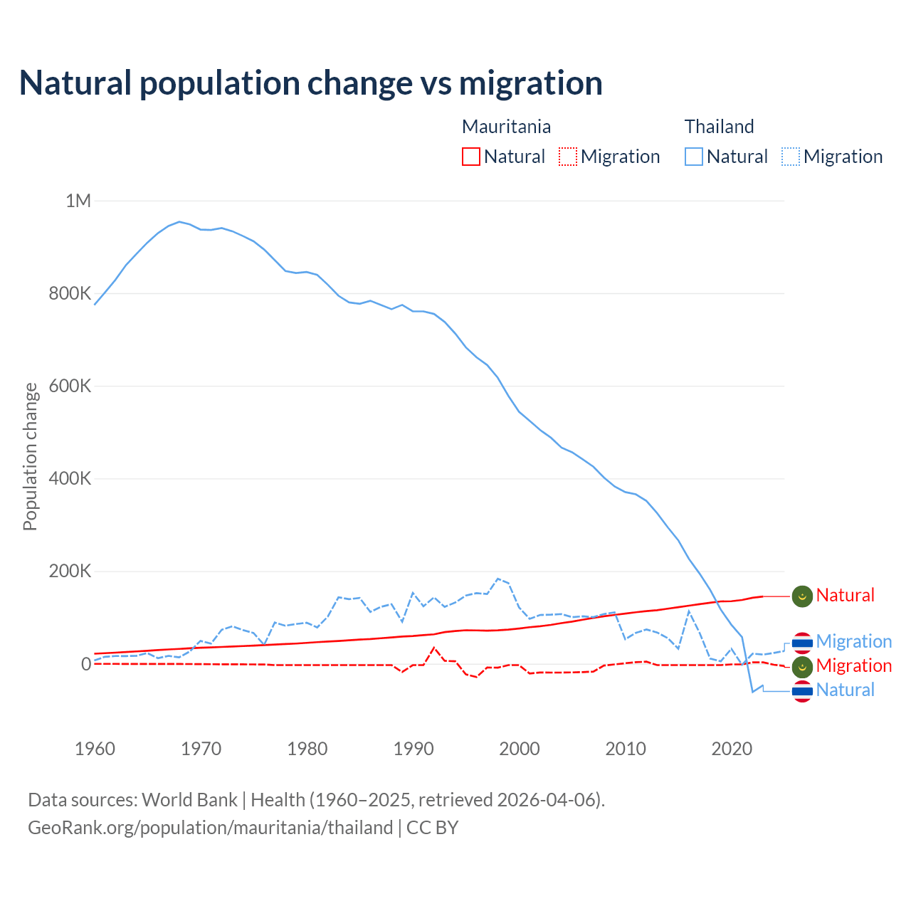 Over the last 10 years, 98.9% of the population change in Mauritania is from natural causes (a gain of 1,320,903 people) and 1.12% is from migration (a loss of 14,982 people). In Thailand 78.4% is from natural causes (a gain of 1,292,528 people) and 21.6% is from migration (a gain of 355,361 people).