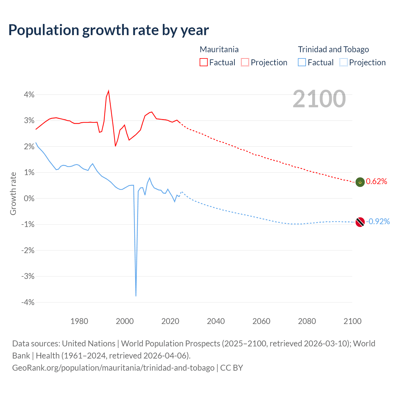 - For the last 10 years, Mauritania has had an average growth rate of +3% per year vs +0.19% in Trinidad and Tobago.