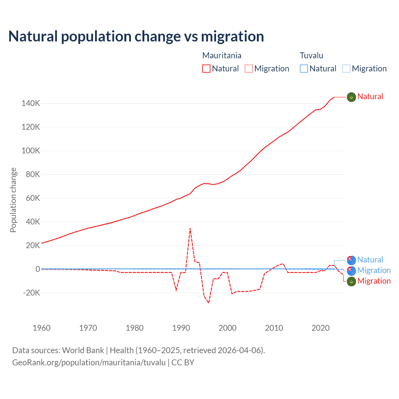 Over the last 10 years, 98.9% of the population change in Mauritania is from natural causes (a gain of 1,320,903 people) and 1.12% is from migration (a loss of 14,982 people). In Tuvalu 35.5% is from natural causes (a gain of 1,556 people) and 64.5% is from migration (a loss of 2,827 people).