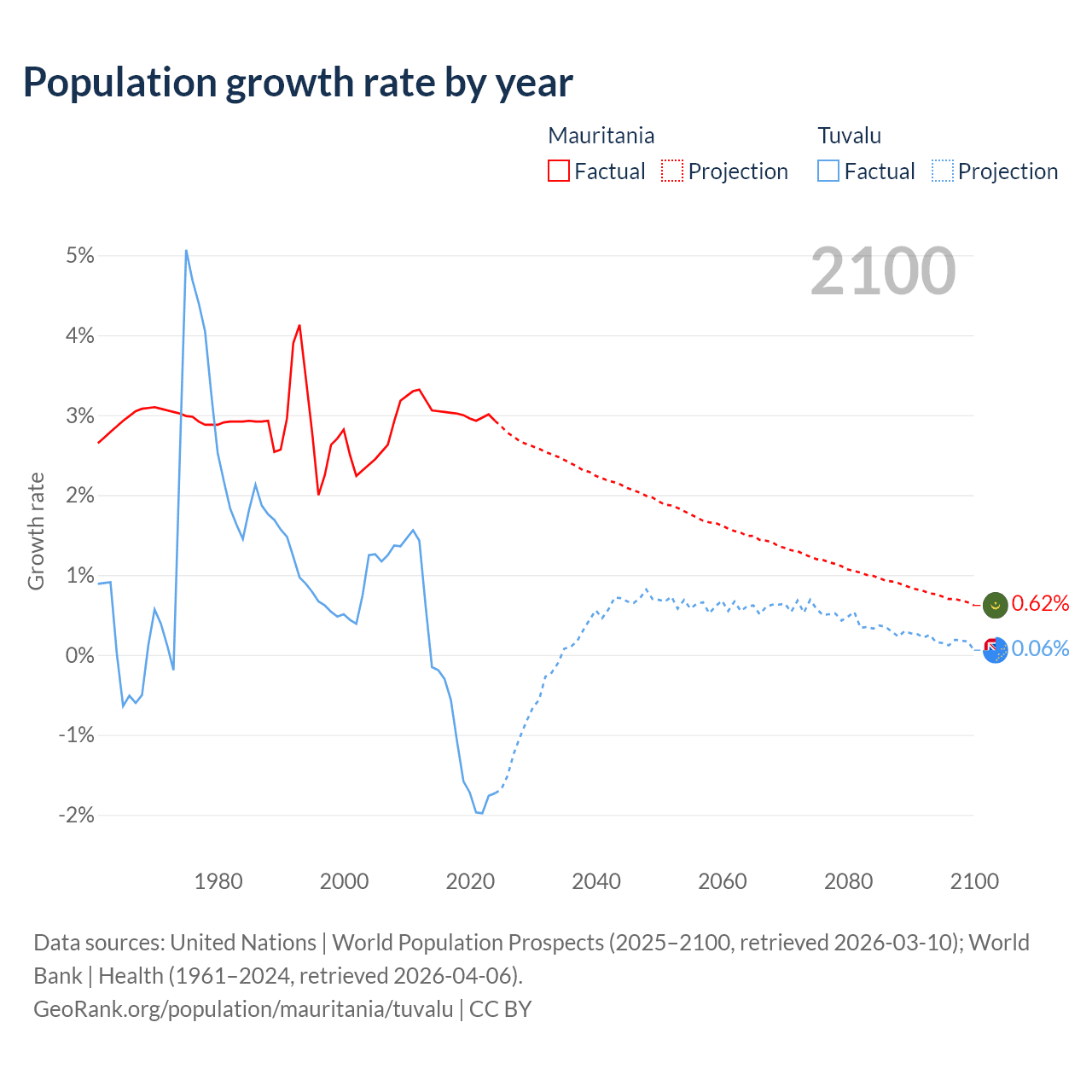 - For the last 10 years, Mauritania has had an average growth rate of +3% per year vs -1.19% in Tuvalu.