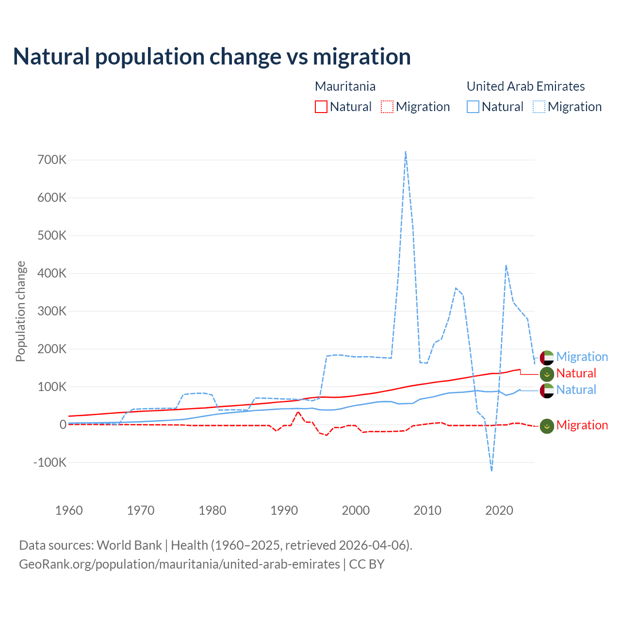 Over the last 10 years, 98.9% of the population change in Mauritania is from natural causes (a gain of 1,320,903 people) and 1.12% is from migration (a loss of 14,982 people). In the United Arab Emirates 30.5% is from natural causes (a gain of 857,996 people) and 69.5% is from migration (a gain of 1,958,520 people).