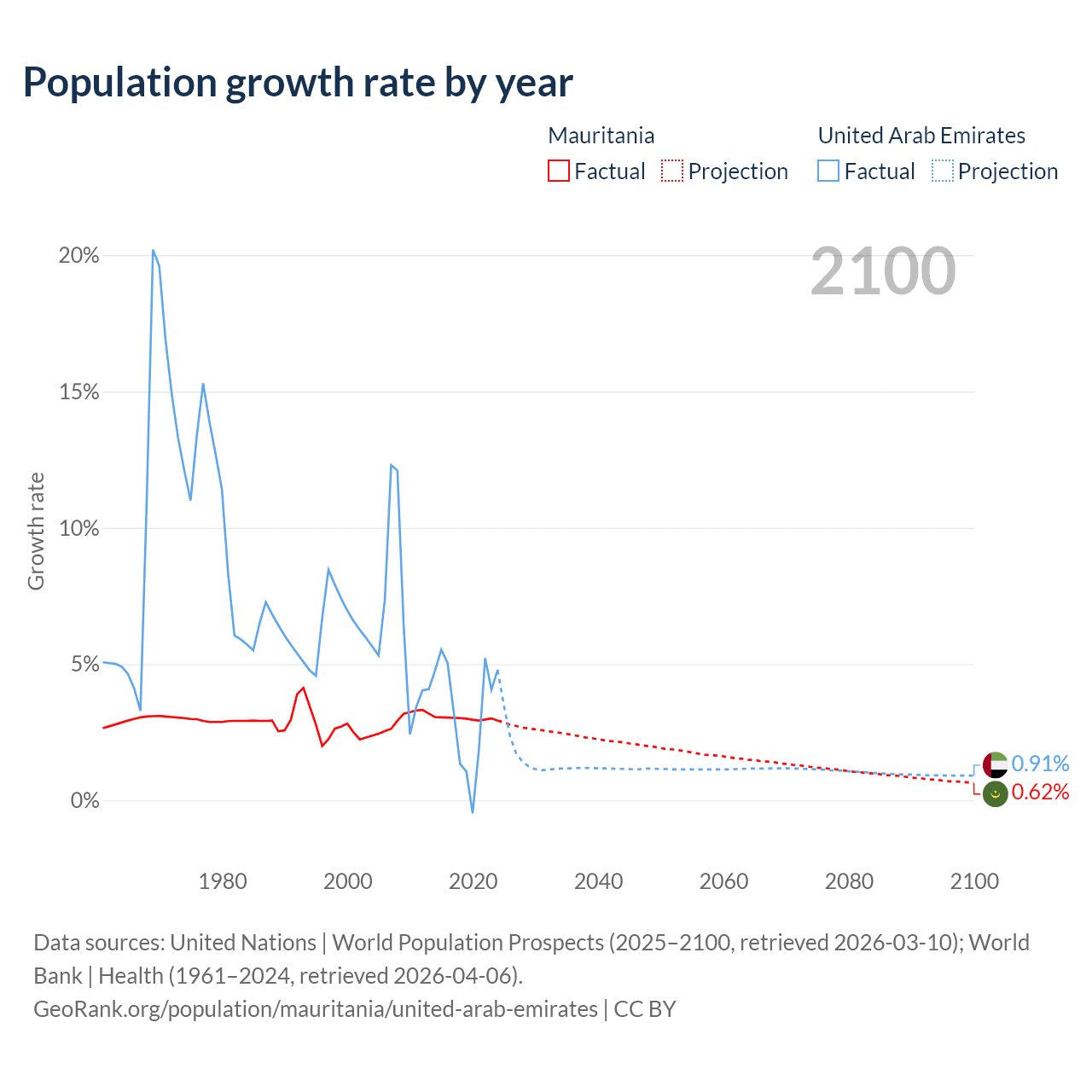 - For the last 10 years, Mauritania has had an average growth rate of +3% per year vs +3.31% in the United Arab Emirates.