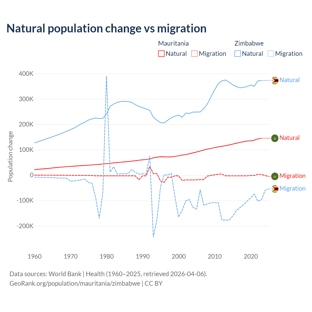 Over the last 10 years, 98.9% of the population change in Mauritania is from natural causes (a gain of 1,320,903 people) and 1.12% is from migration (a loss of 14,982 people). In Zimbabwe 74.9% is from natural causes (a gain of 3,558,487 people) and 25.1% is from migration (a loss of 1,192,807 people).