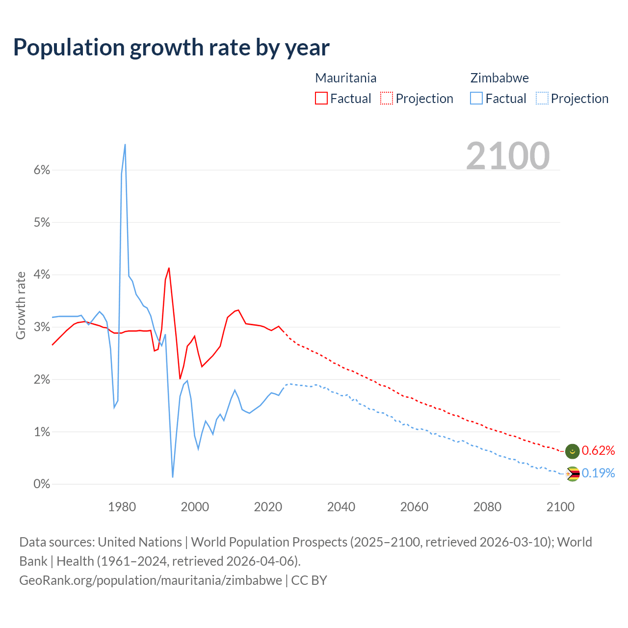 - For the last 10 years, Mauritania has had an average growth rate of +3% per year vs +1.57% in Zimbabwe.