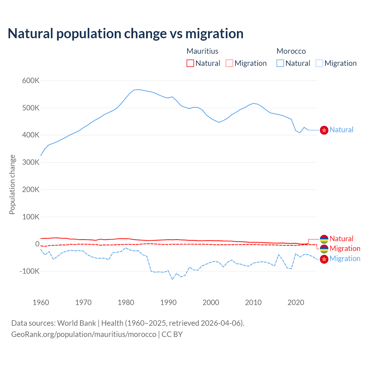Over the last 10 years, 30.9% of the population change in Mauritius is from natural causes (a gain of 19,327 people) and 69.1% is from migration (a loss of 43,294 people). In Morocco 88.3% is from natural causes (a gain of 4,495,223 people) and 11.7% is from migration (a loss of 594,083 people).