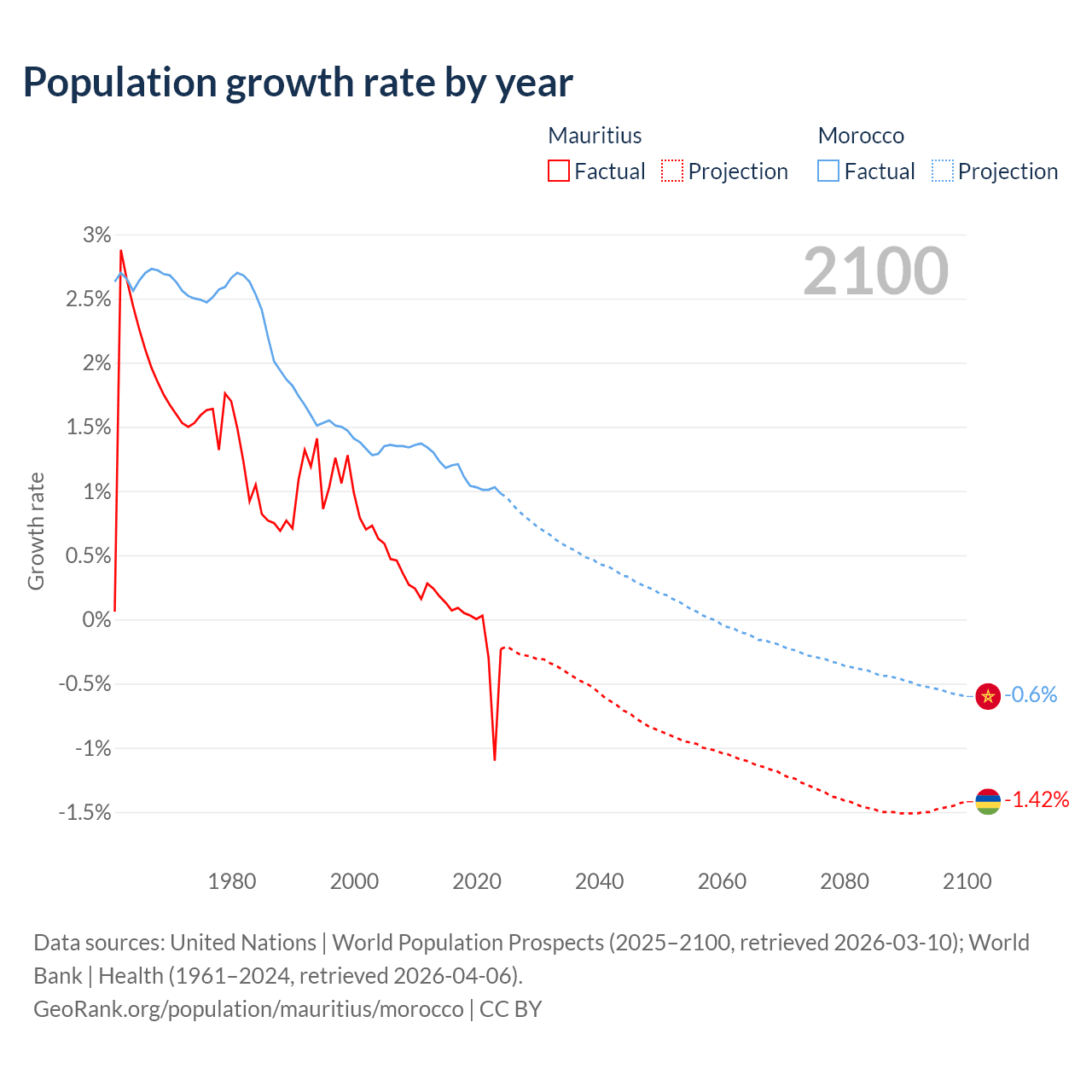 - For the last 10 years, Mauritius has had an average growth rate of -0.09% per year vs +1.09% in Morocco.