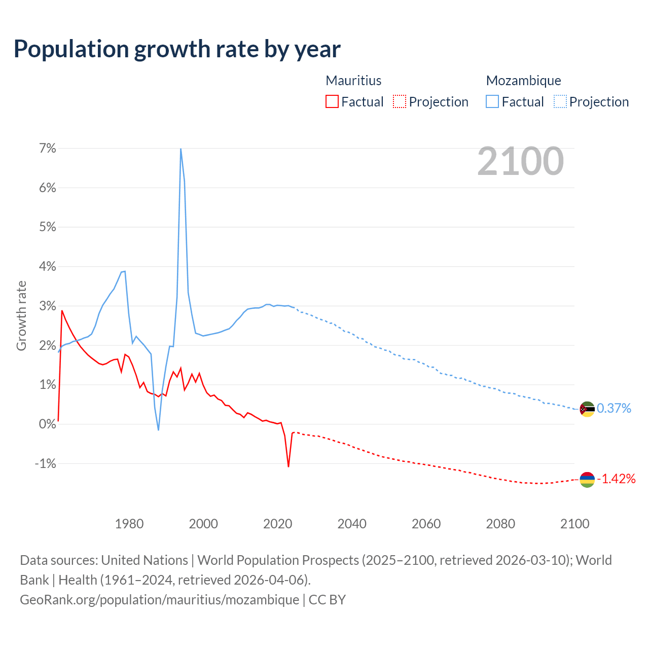 - For the last 10 years, Mauritius has had an average growth rate of -0.09% per year vs +2.99% in Mozambique.