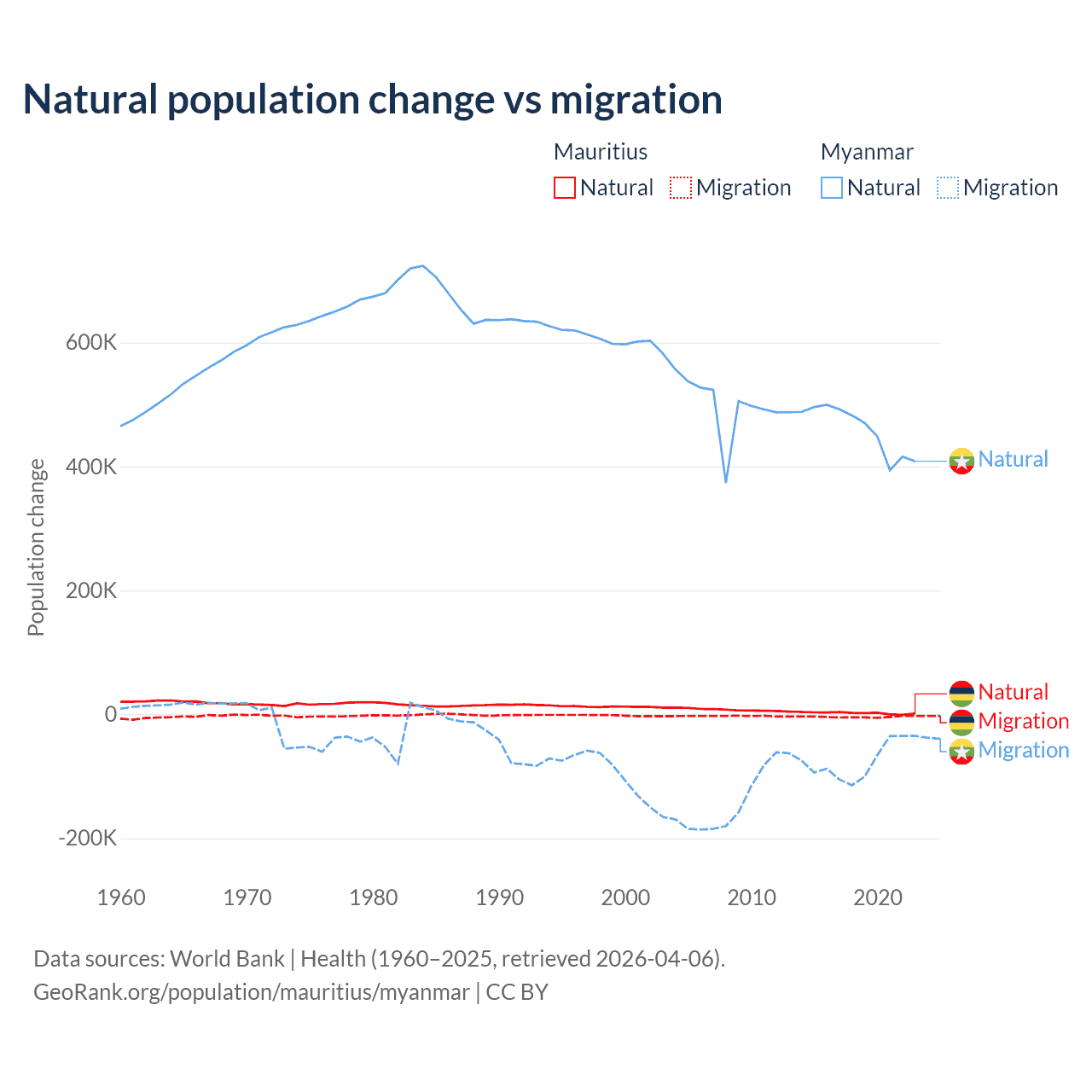 Over the last 10 years, 30.9% of the population change in Mauritius is from natural causes (a gain of 19,327 people) and 69.1% is from migration (a loss of 43,294 people). In Myanmar 86% is from natural causes (a gain of 4,594,615 people) and 14% is from migration (a loss of 749,272 people).