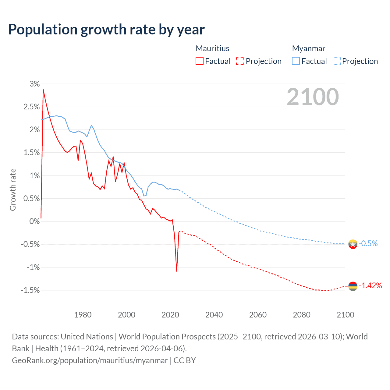 - For the last 10 years, Mauritius has had an average growth rate of -0.09% per year vs +0.74% in Myanmar.