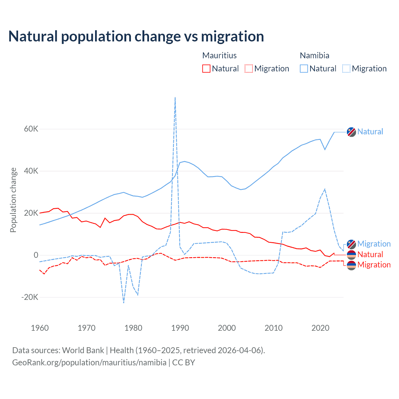 Over the last 10 years, 30.9% of the population change in Mauritius is from natural causes (a gain of 19,327 people) and 69.1% is from migration (a loss of 43,294 people). In Namibia 74.3% is from natural causes (a gain of 532,532 people) and 25.7% is from migration (a gain of 183,837 people).