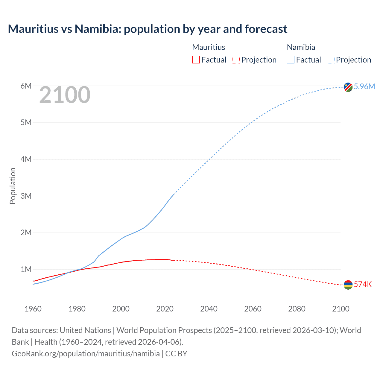Mauritius vs Namibia: population by year and forecast
