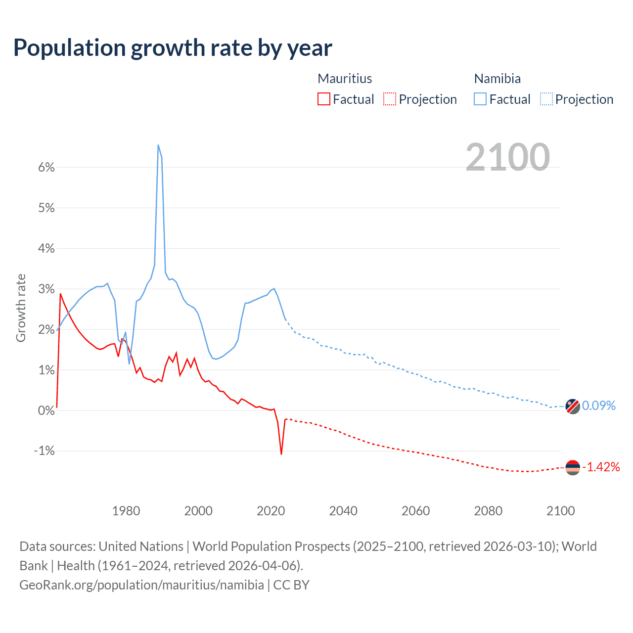 - For the last 10 years, Mauritius has had an average growth rate of -0.09% per year vs +2.73% in Namibia.
