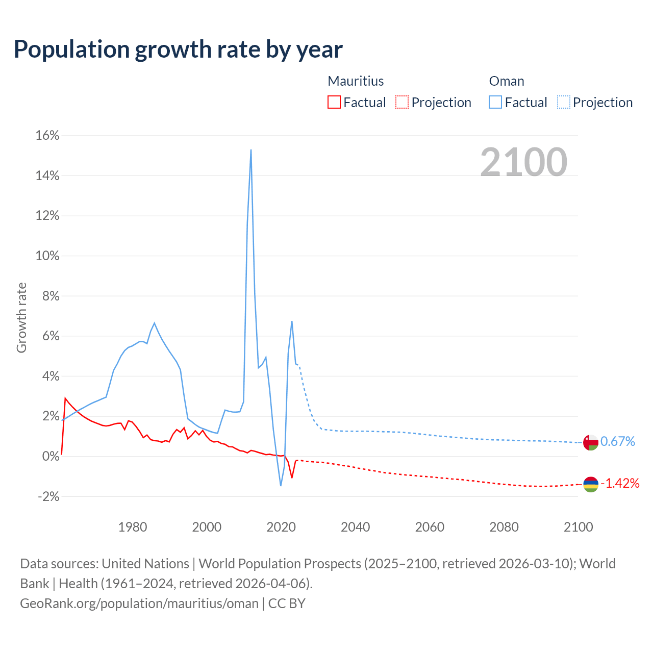 - For the last 10 years, Mauritius has had an average growth rate of -0.09% per year vs +2.99% in Oman.