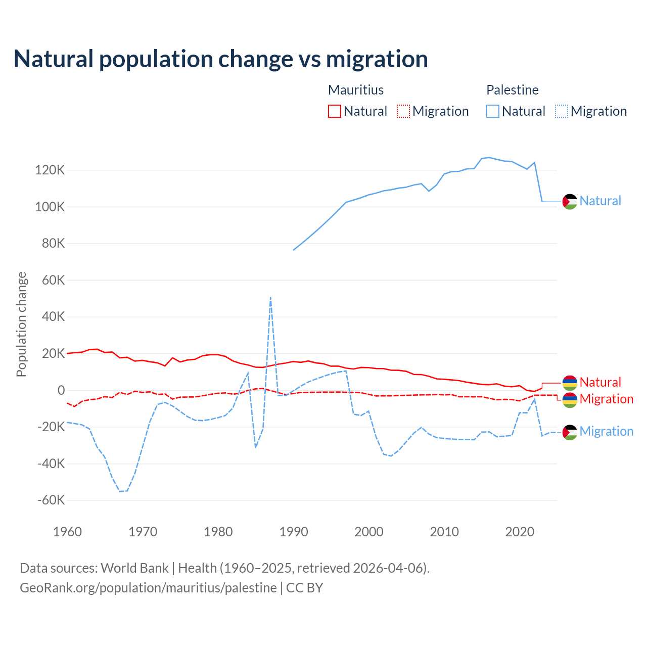 Over the last 10 years, 30.9% of the population change in Mauritius is from natural causes (a gain of 19,327 people) and 69.1% is from migration (a loss of 43,294 people). In Palestine 85.7% is from natural causes (a gain of 1,218,010 people) and 14.3% is from migration (a loss of 202,820 people).