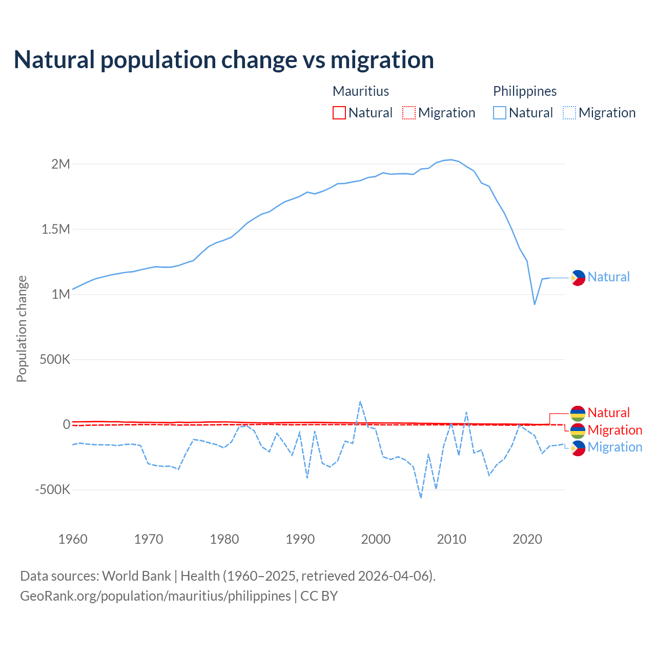 Over the last 10 years, 30.9% of the population change in Mauritius is from natural causes (a gain of 19,327 people) and 69.1% is from migration (a loss of 43,294 people). In the Philippines 88.5% is from natural causes (a gain of 14,279,705 people) and 11.5% is from migration (a loss of 1,848,117 people).